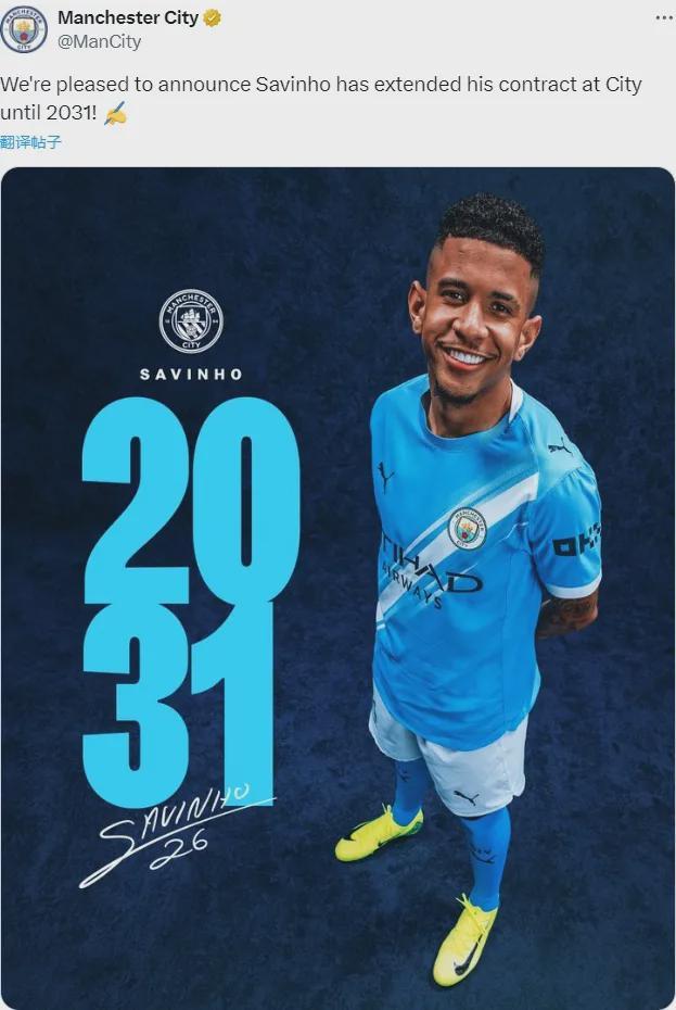 官方:曼城宣布和萨维尼奥续约到了2031年。