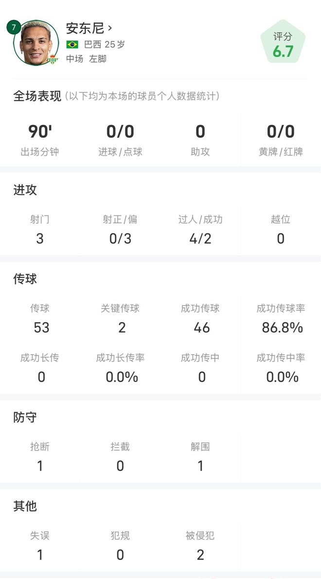 此役,安东尼代表贝蒂斯首发并踢满全场,没能贡献进球或助攻,3次射门0射正,4次尝试过人2次成功,同时还有13次丢失球权;