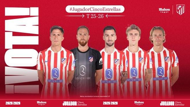 马竞10月最佳球员候选名单公布,这5名球员为朱利亚诺-西蒙尼、奥布拉克、巴埃纳、巴勃罗-巴里奥斯、马科斯-略伦特。