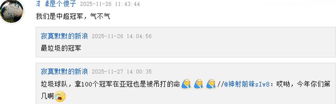 在直播吧这篇首尔FC主帅的赛后发言文章的评论区,有某队球迷回复(上图)道:“我们是中超冠军,气不气?”