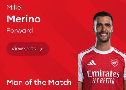 传射建功,梅里诺当选阿森纳vs小蜜蜂全场最佳球员