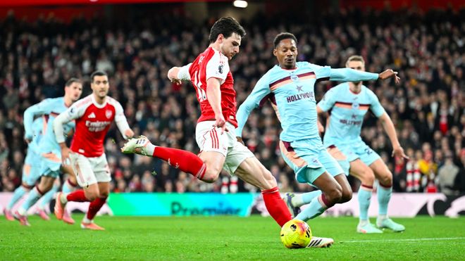 阿森纳也有扩大比分的机会,第37分钟,梅里诺将球分到左路,赖斯的传中刚好越过两名后卫,马杜埃凯的射门被挡出了底线。
