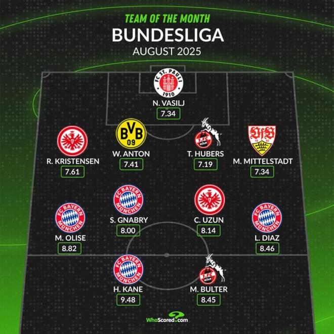 whoscored列德甲8月最佳阵:凯恩领衔拜仁前场4人组,安东在列
